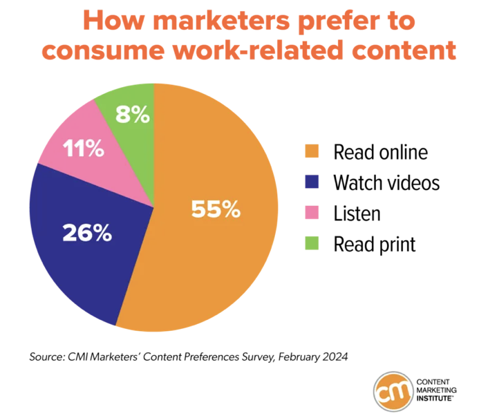 Por ejemplo: en el primer Estudio de Marketing para Profesionales de Marketing de CMI concluyó que el 55 % de los profesionales del marketing prefiere consumir contenido relacionado con el trabajoleyendo en línea. El 26 % opta por vídeos, el 11 % prefiere escucharlos y el 8 % opta por la versión impresa.